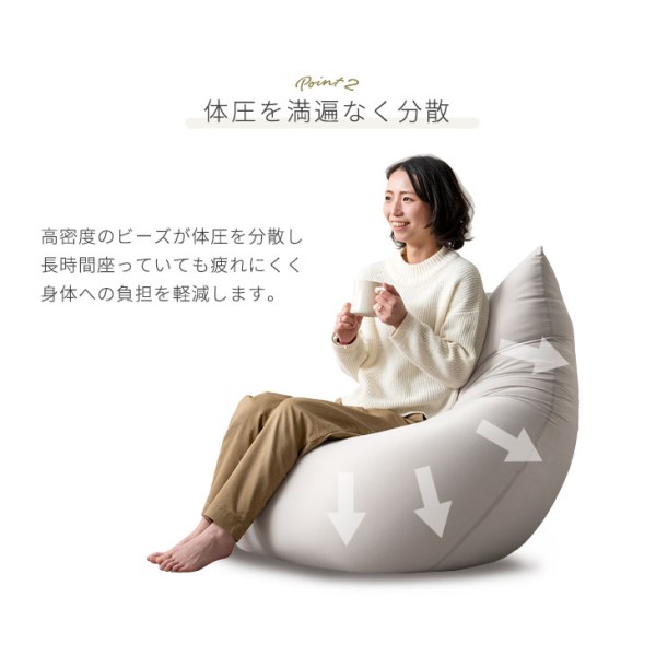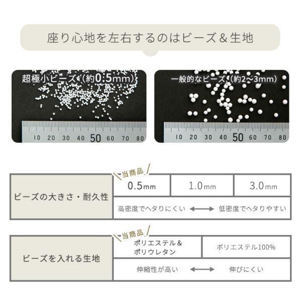 - へたり具合次第ですが、硬すぎず沈み過ぎずいいクッションです! ただ、交換用ビーズの販売がなく、ヘタったら自分たちでビーズ探してくださいという印象を受けたので、少々残念です。