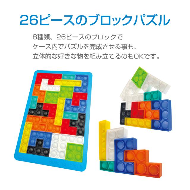【26ピースのブロックパズル】8種類、26ピースのブロックで、ケース内でパズルを完成させることも、立体的な好きなものを組み立てるのもOKです。