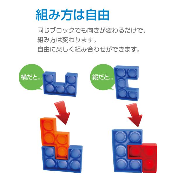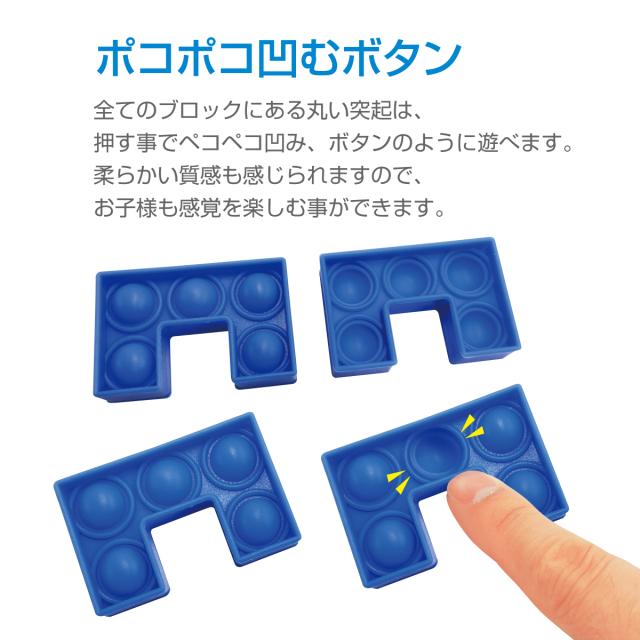 【ボコボコ凹むボタン】全てのブロックにある丸い突起は、押すことでペコペコ凹み、ボタンのように遊べます。柔らかい質感も感じられますので、お子様も感覚を楽しむことができます。