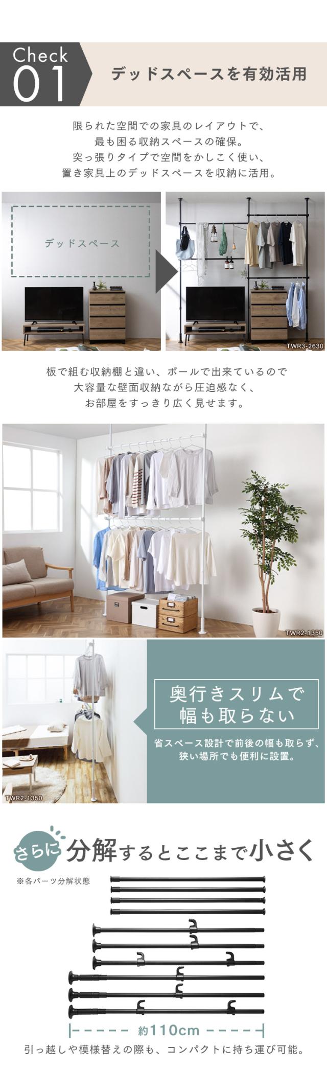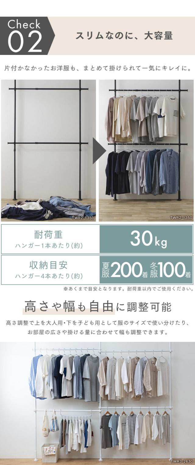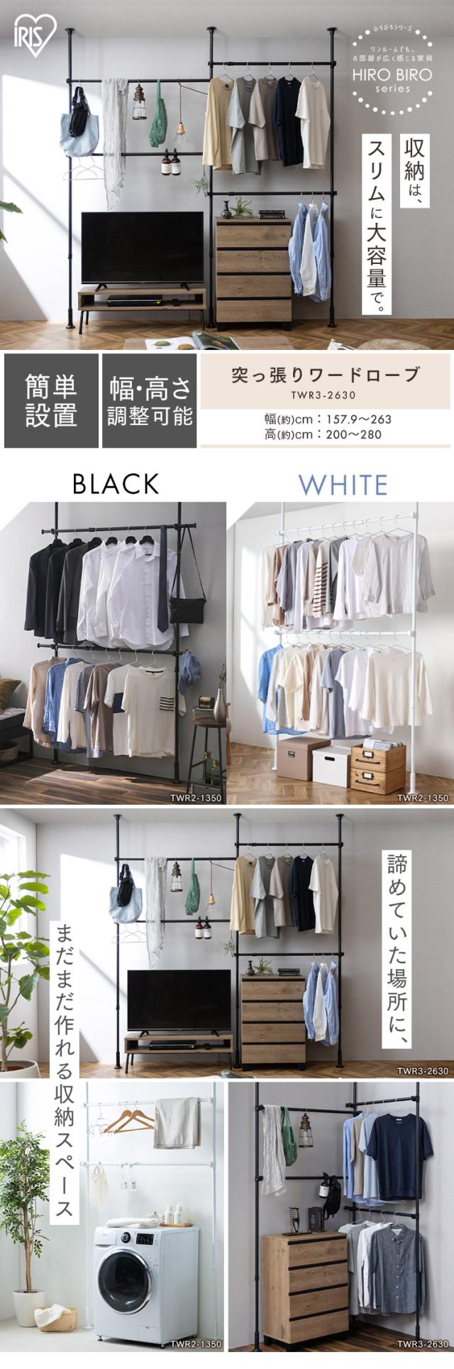 突っ張りワードローブ TWR3-2630 ブラック ホワイト 全2色 ワードローブ 突っ張り棒 棚 突っ張りラック ハンガーラック ハンガースタンド 物干し 伸縮 調整可能 衣類収納 洋服収納 アイリスオーヤマ 送料無料
