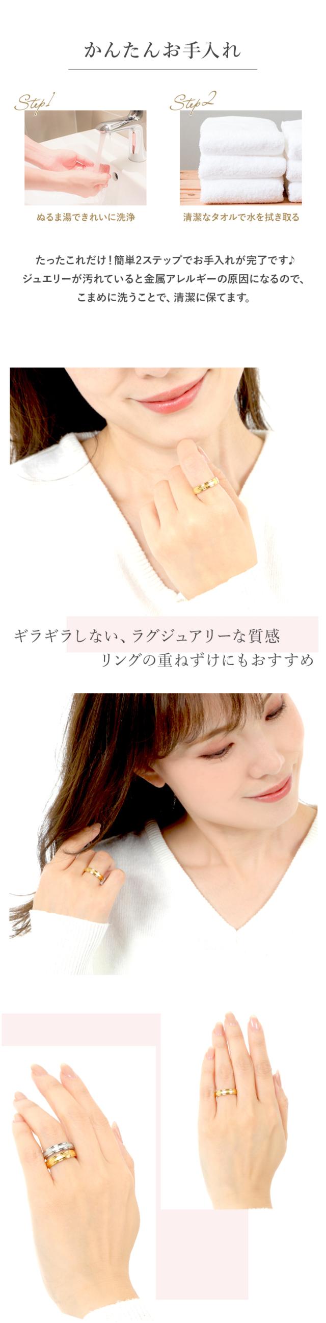 「 サージカルステンレス 」のリングは普段使いにもぴったり。1本でも素敵ですが、重ね付けもお洒落。お手持ちのリングに適度な存在感でバランスよくメインのリングを引き立たせてくれます。重ね付けすることでボリュームアップもでき、コーディネートのポイントにもなります