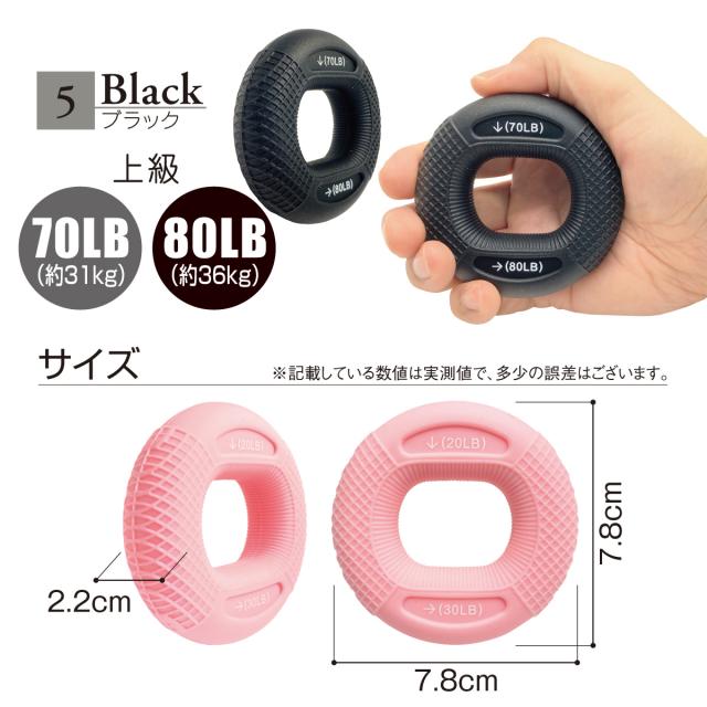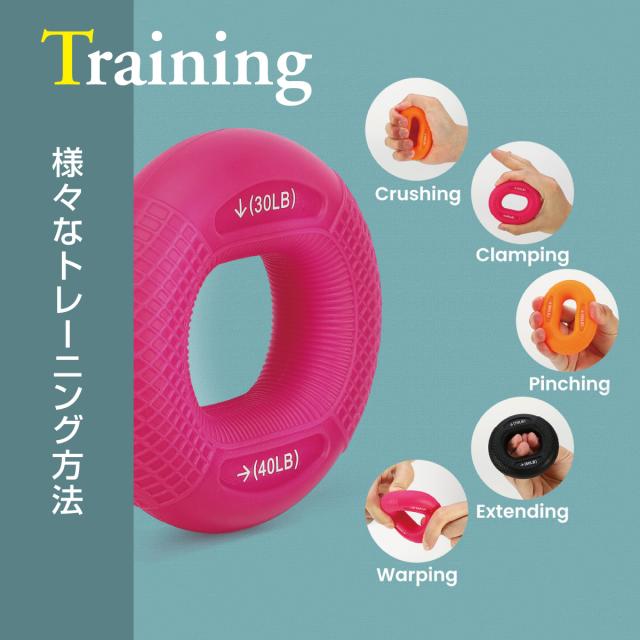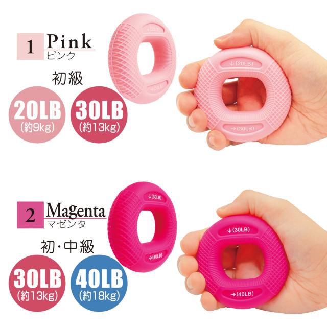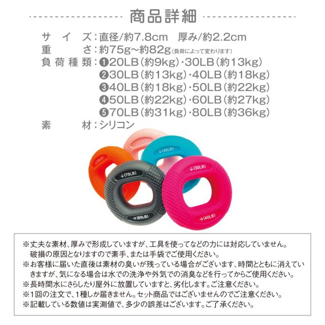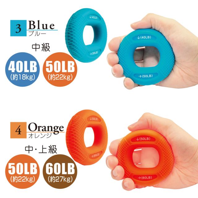 20LB-30LB、30LB-40LB、40LB-50LB、50LB-60LB、70LB-80LB 初級用から上級用まで5種類あり、自分にあったハンドグリップをお選びください。
