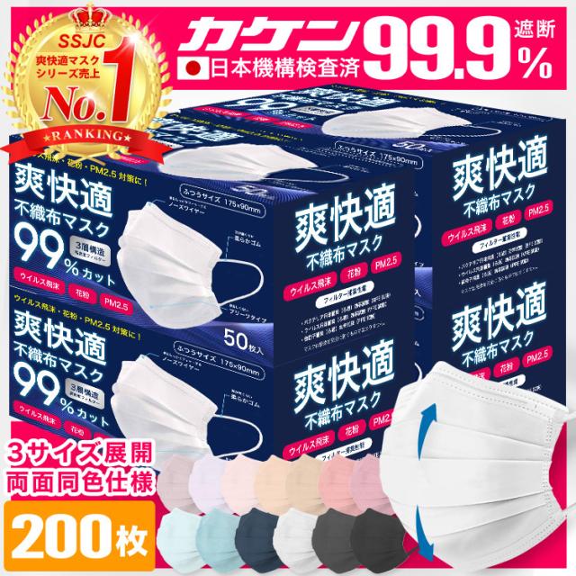マスク 不織布 不織布マスク PREMIUM爽快適マスク 99%遮断 耳が痛くならない 不織布 カラーマスク 使い捨てマスク 200枚 50枚×4箱 立体 オメガプリーツ 日本 企画 大人 やわらか 包装 爽快適 送料無料 子供 子ども SOKAITEKI