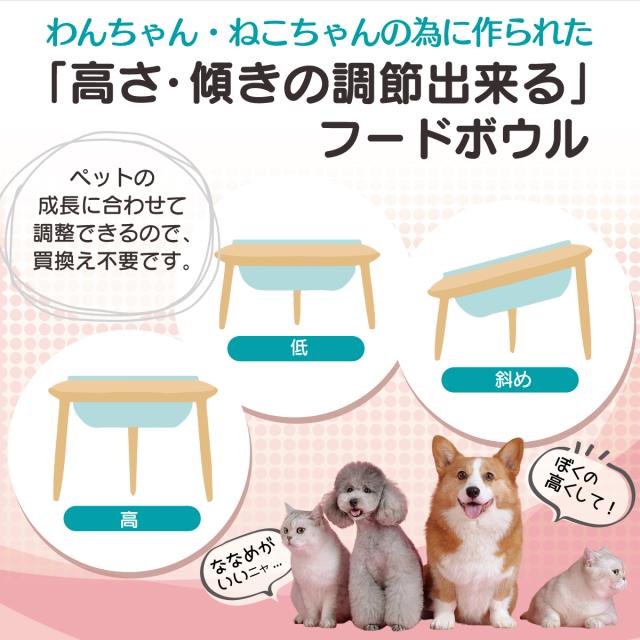 【高さ・傾きが調節できるエサ皿】わんちゃんねこちゃんのために作られた高さ・傾き調節ができる、とっても機能的なお洒落なフードボウルの登場です。高く、低く、斜めにしたりと3段階に変えられるのでペットの成長に合わせて使えるため買い替えが不要なエサ皿です。