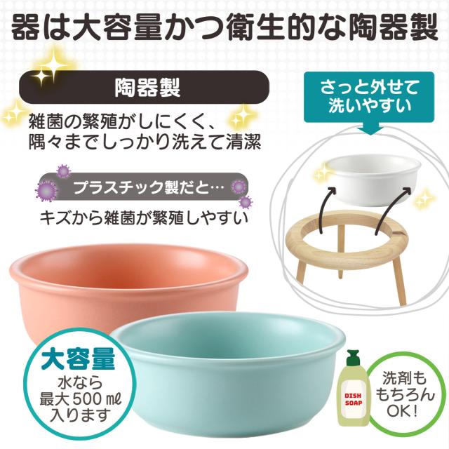 【使い勝手のいい陶器製のお皿】お皿は陶器製で雑菌の繁殖がしにくい仕様です。重量は約370gで、やんちゃなネコちゃんが勢いで飛びついても、ひっくり返しにくい設計です。また、電子レンジや食洗器も対応しているので毎日の生活にも使いやすいエサ皿です。
