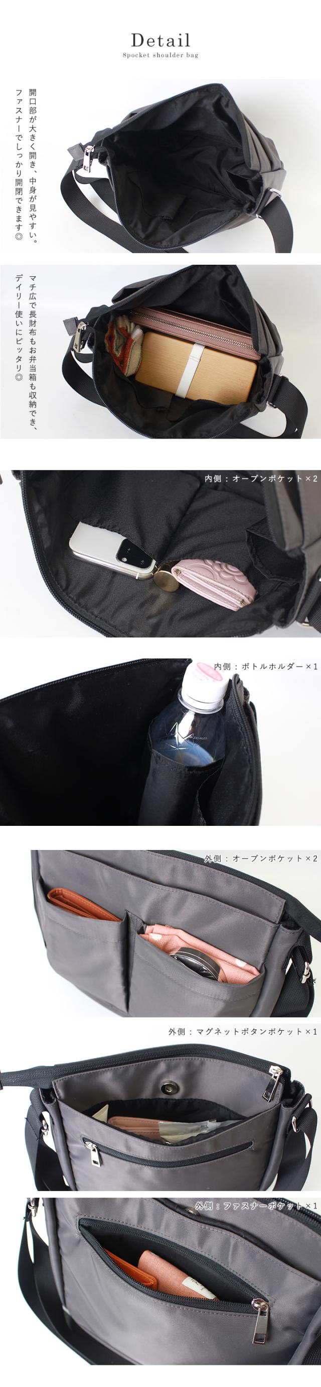 - 軽いショルダーバッグを探していて使い勝手の良いこの商品を購入しました 少し残念なのはペットボトルのお茶が600mlあるので横にしないと入らないことです