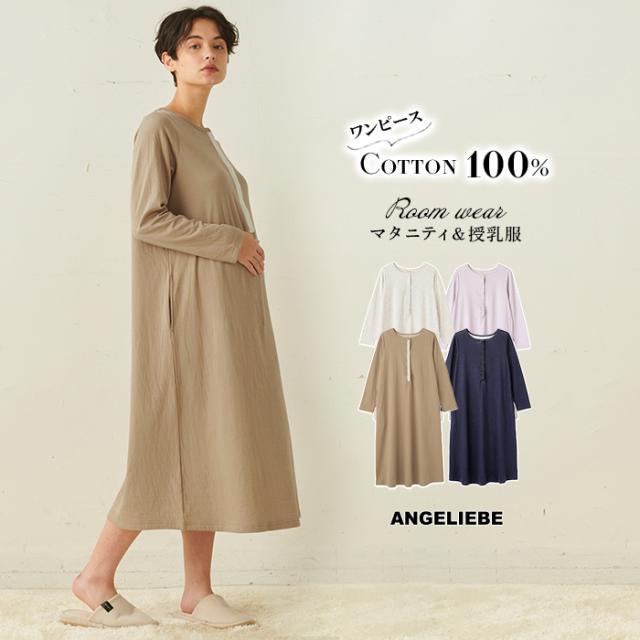 綿100% Aライン ワンピース ネグリジェ 授乳服 妊婦服 長袖 マタニティ パジャマ 無地 妊婦 ルームウェア 部屋着 出産準備