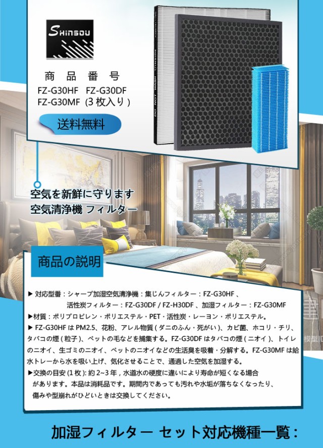 シャープ FZ-G30HF FZ-G30DF FZ-G30MF 集じんフィルター 加湿フィルター kc-30t5 kc-30t6 活性炭フィルター FZG30HF FZG30DF FZG30MF sharp フィルターセット 加湿空気清浄機用 非純正品