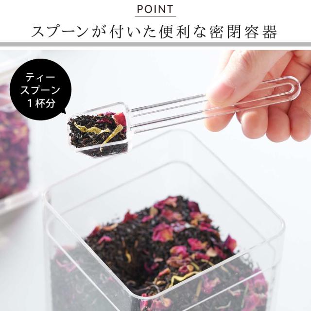バルブで密閉できるスプーン付き保存容器。茶葉や調味料、乾物など、作り置きなどの保存に。