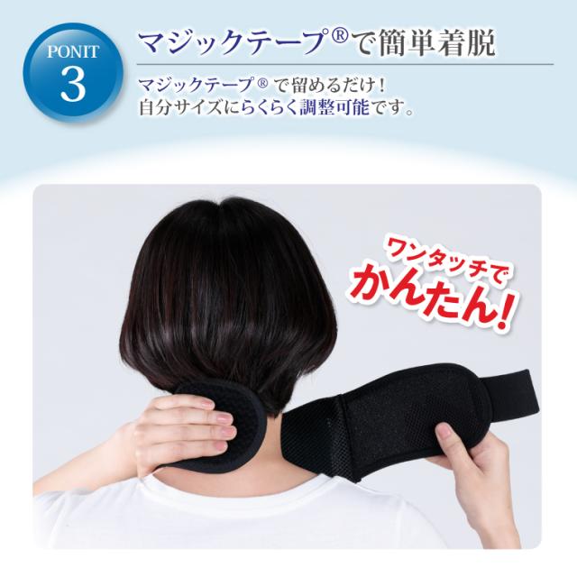| ご使用上の注意 | ●就寝時には使用しないでください。 ●アレルギー体質・湿疹性・汗でかぶれやすい方のご使用はお避けください。 ●初めての方は短い時間からご使用され、徐々に時間を延長してください。 ●首部分以外には使用しないでください。 ●首痛等で現在通院されている方及び、関節炎等首に炎症のある方は、ご使用前に医師にご相談ください。 ●本品を装着中に異常を感じたら、直ちに使用を中止し医師の診断を受けてください。 ●長時間ご使用になる時は、適度に脱着を行なってください。 ●破損した場合には思わぬ事故やケガの原因になりますので、使用しないでください。 |
