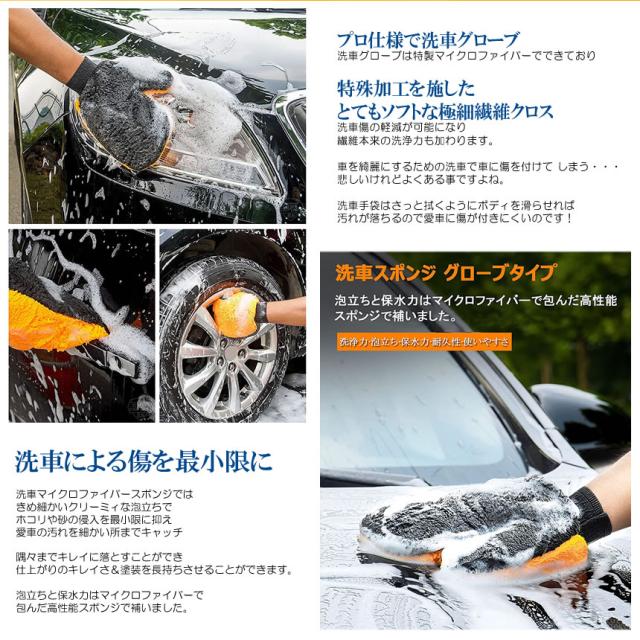 - 以前は、マイクロファイバークロス使ってましたが、洗車中クロス落して汚れて洗い直したりで余計な作業が入ってたので このグローブつかってから洗車が楽になりました。
