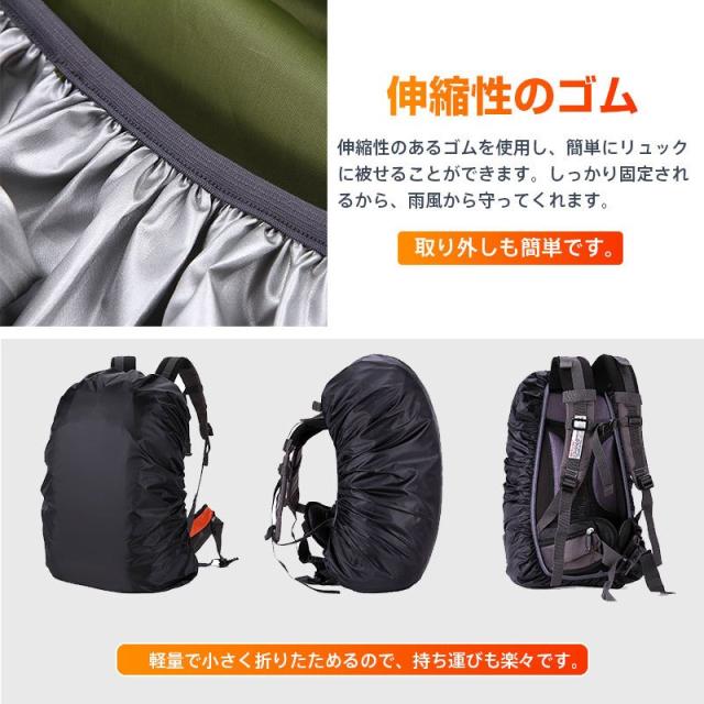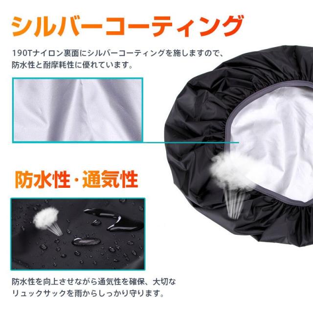 リュックサック用レインカバーです。レジャー、スポーツ、災害時、通勤、旅行など色々なシーンで使用することができます!190Tナイロン裏面にシルバーコーティングを施しますので、防水性と耐摩耗性に優れています。防水性を向上させながら通気性を確保、大切なリュックサックを雨からしっかり守ります。伸縮性のあるゴムを使用し、簡単にリュックに被せることができます。しっかり固定されるから、雨風から守ってくれます。取り外しも簡単です。大切なリュックを保護するお助けアイテムとなります。