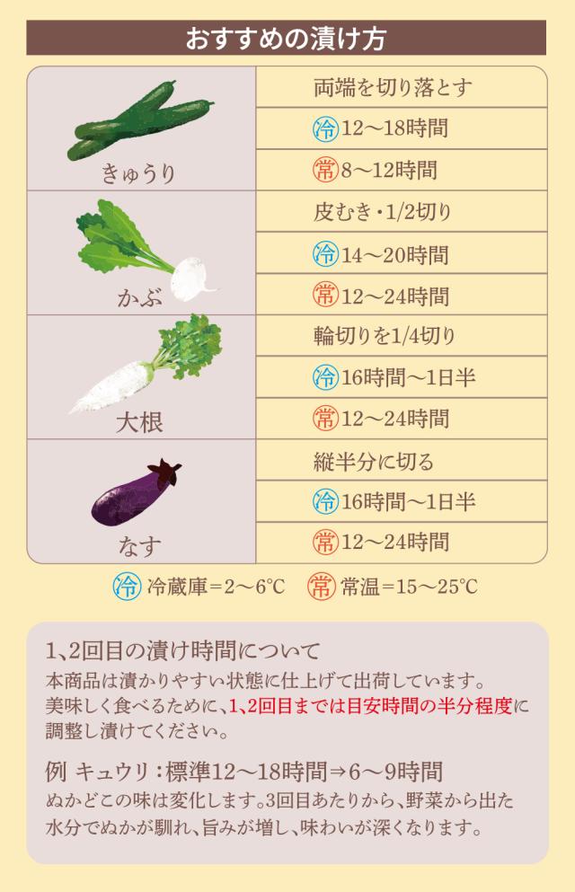 伝統的な手法、ぬか本来の力で時間をかける自然発酵で完熟させました。ぬか本来の自然な香りです。(新鮮な生糠を時間を置かず焙煎しています。)調味料は北海道産昆布の自然の旨みを生かし、冷蔵庫で手軽に漬けられます。樽出し・化学調味料無添加・自然発酵完熟タイプのぬかみそです。