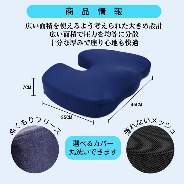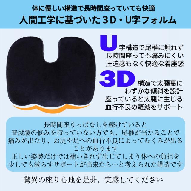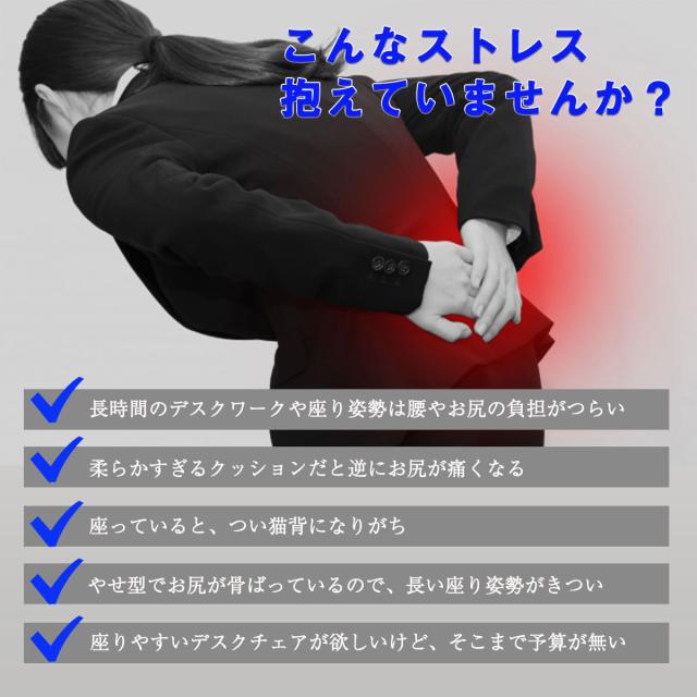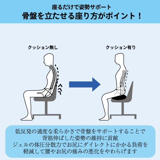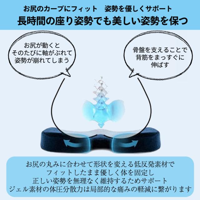臀部や太ももへの圧力を吸収・分散させ、長時間座っても疲れにくく、快適な座り心地のクッションです。