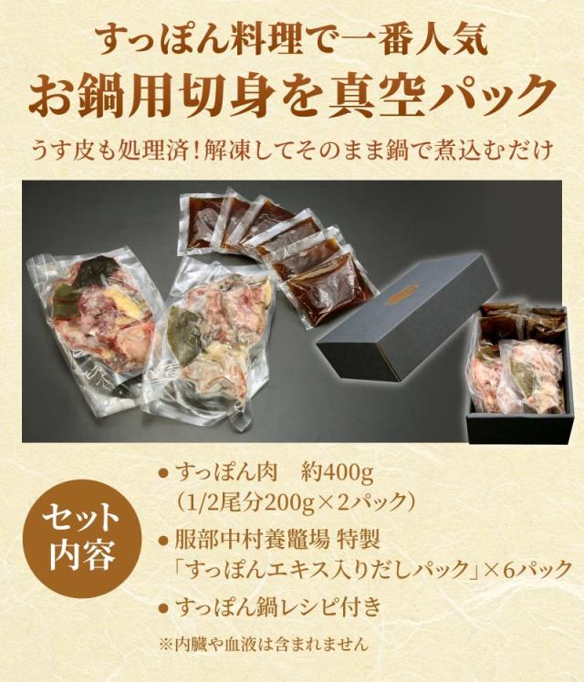 すっぽん料理で一番人気のお鍋用切身を真空パックしてあります。うす皮も処理済なので、解凍してそのまま鍋で煮込むだけです。服部中村養べつ場特製「すっぽんエキス入りだしパック」もお付けします。すっぽん鍋のレシピ付き。