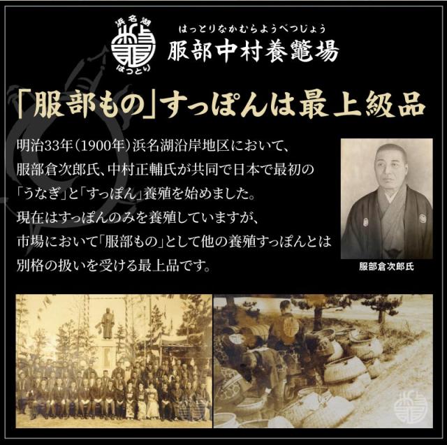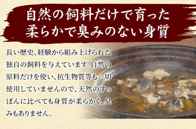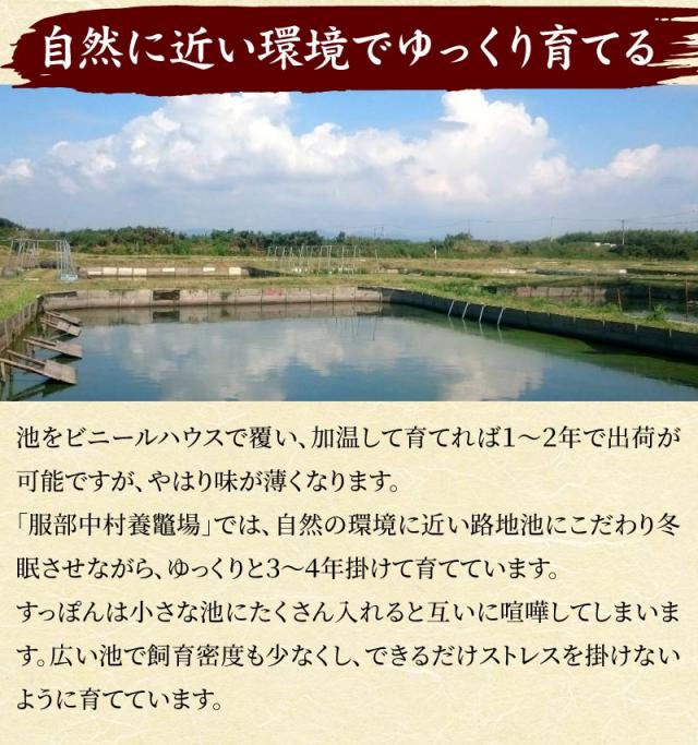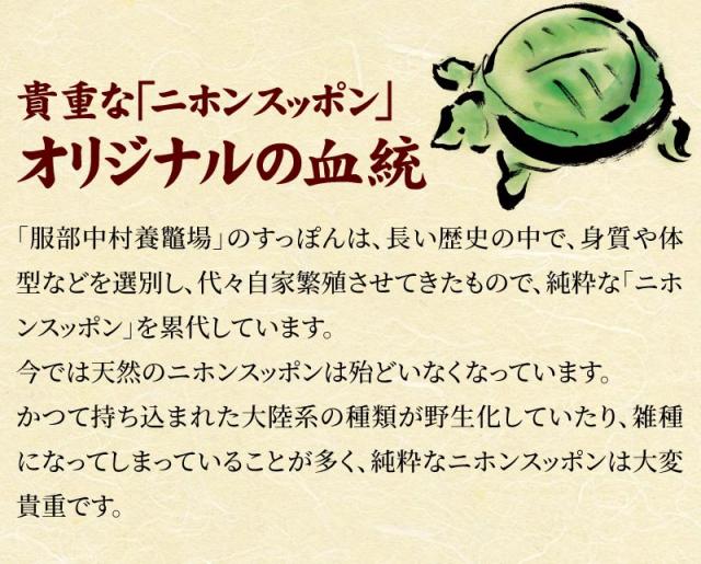 自然の原料だけを使った独自開発の飼料を与え、ゆっくりと3〜4年、自然に近い環境で育てているので、天然のすっぽんに比べても身質が柔らかく臭みもありません。良質な脂肪とコクのある味わいを持った「服部のすっぽん」は、全国の高級料理店で高い評価を受けています。