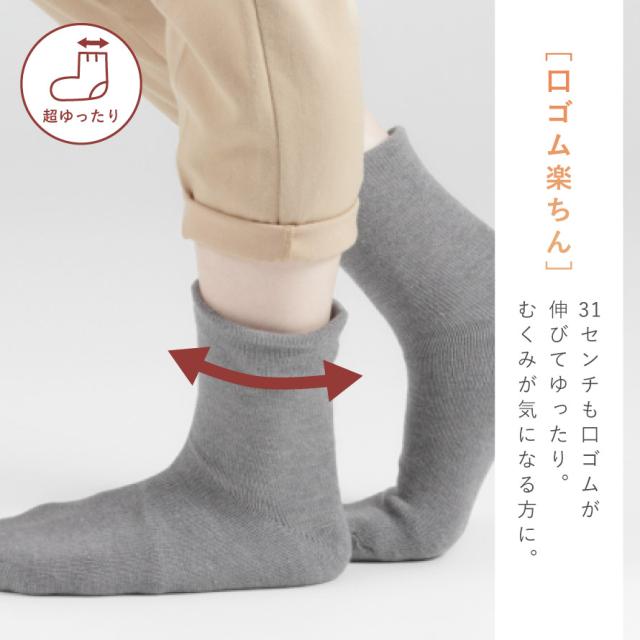 履き口部(口ゴム)が約31cm伸びる超ゆったり設計。足首ゆったりのタイプの靴下の中でも、かなりゆったりしたタイプになります。足首をしめつけず、むくみが気になる方にもおすすめです。