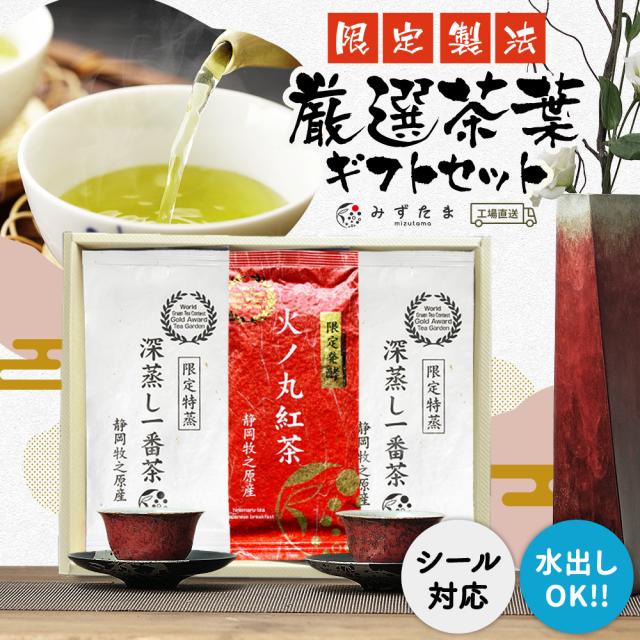 お中元に ギフト セット お茶 2種 緑茶 和紅茶 茶葉 深蒸し一番茶 ×2袋 火ノ丸紅茶 ×1袋 100g×3袋 熨斗対応 静岡 静岡茶 ギフト 贈答用 プレゼント 贈答 プチギフト プレゼント 送料無料 宅配便 紅茶 限定特蒸 箱入り ギフトボックス