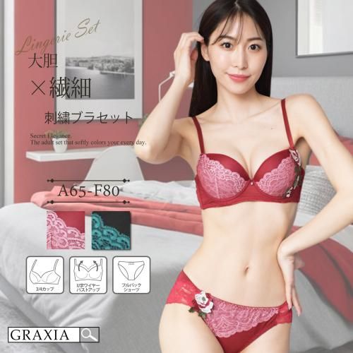【グラシア】 ブラジャー ショーツ セット ブラセット ランジェリー 下着 チャーム カップ ダークカラー ラメ 刺繍 繊細 胸元 大胆 フィット感 レース バラ グラマラス ブラック レッド
