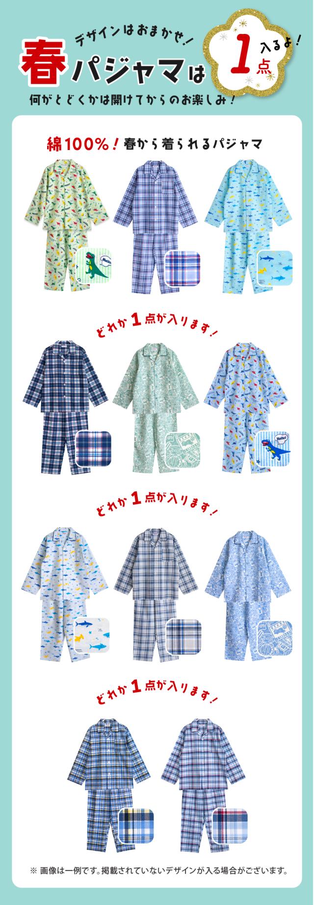キッズ 男の子パジャマ福袋3点セット 送料無料! ¥3,280(税込) ※ 沖縄県の場合は送料が「870円」となります。 詳しくはお問合せ下さい。 今の時期にちょうど良く、すぐ着れるパジャマをご用意! 【 どれか2点入ります】 ・綿100% 冬のネル起毛前開きパジャマ ・内側が綿100% 冬パジャマ 【 どれか1点が入ります】 ・綿100% 春・秋にちょうどいい前開きパジャマ ・綿100% 春・からの薄手長袖前開きパジャマ ・綿100% 春からの長袖Tシャツパジャマ ※色柄は当店におまかせ下さい。 ※ 昨年ご購入いただきました場合、同じ柄をお届けする場合がございます。 ・男の子福袋 120-160cm はコチラ>>> ・男の子福袋 100-110cm はコチラ>>> ・女の子福袋 120-160cm はコチラ>>> ・女の子福袋 100-110cm はコチラ>>> |