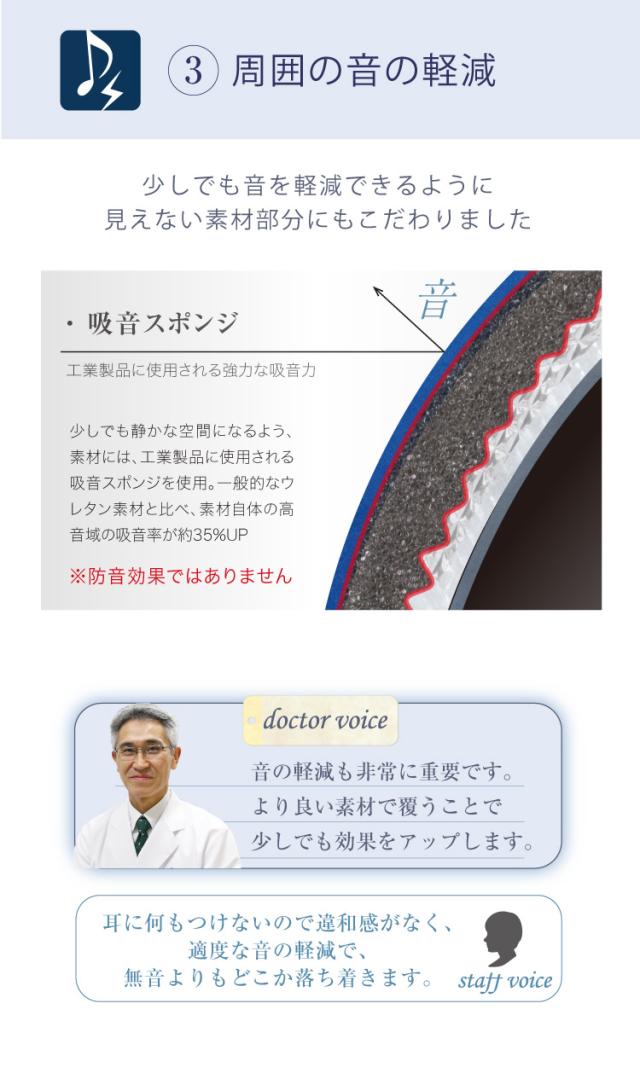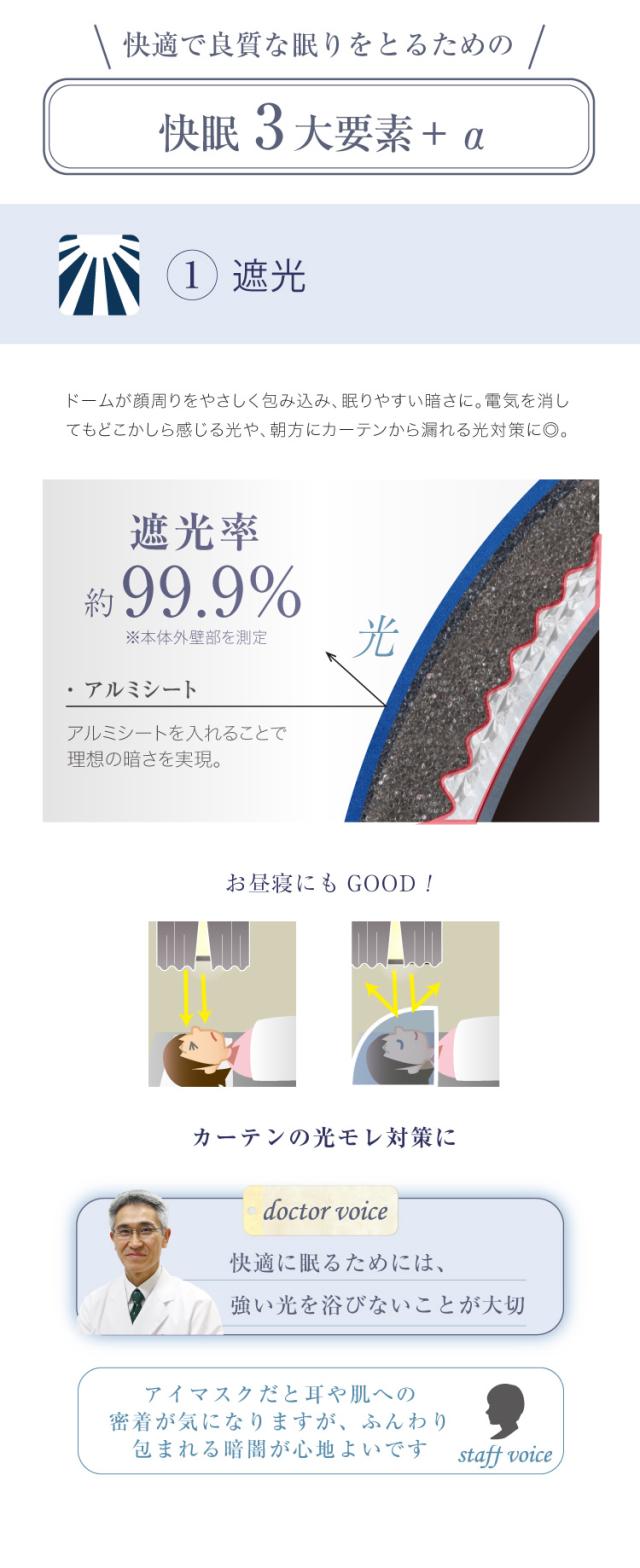 このつの要素を叶えるのがこのドーム。顔周りを覆うことで適度な閉塞感が生まれ、心地よく眠ることができます。本商品のドーム部分には光や音を遮断する特殊構造を採用。一般的なウレタンに比べて吸音率が高く、ドームに入ってみるとそっと耳を塞がれているような、ソフトな耳栓をしているような、そんな静けさが得られます。