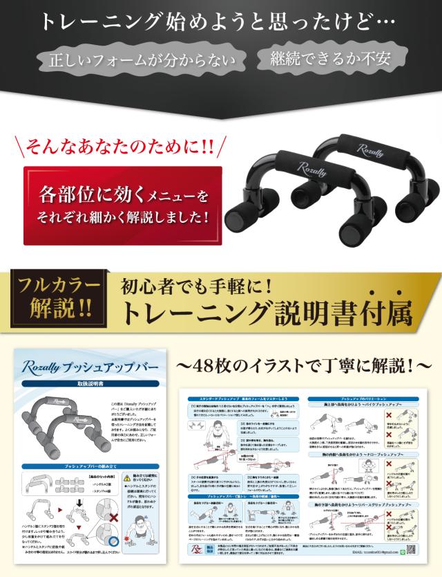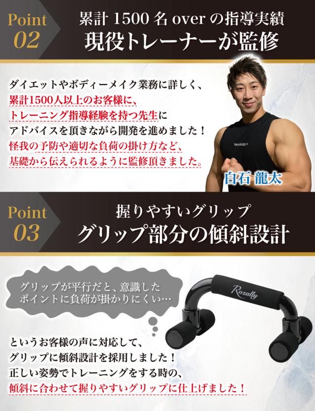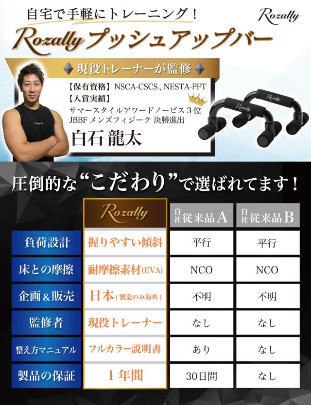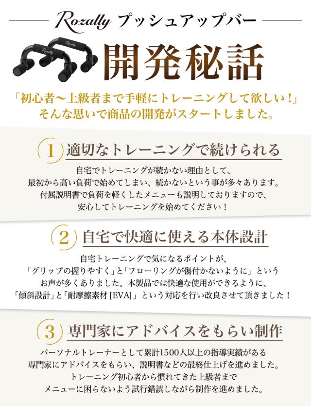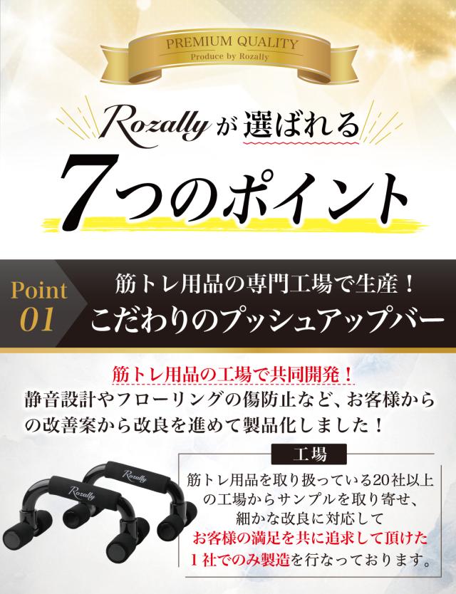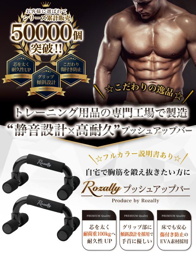 様々なメーカーから ” プッシュアップバー ”が販売されていますが、 Rozallyの プッシュアップ バー は ”掴みやすい傾斜”と”静音設計”が一味違います。 トレーニング用品 や ダイエット用品 をメインに取り扱っている 10社以上の工場からサンプルを取り寄せ、 強度と形状を一緒に試行錯誤して頂けた 1社に絞って発注を行なっています。 家トレ で 胸筋 をしっかり鍛えるアイテムとして コンパクト かつ 簡単組み立ての 筋トレ グッズ になります。 |