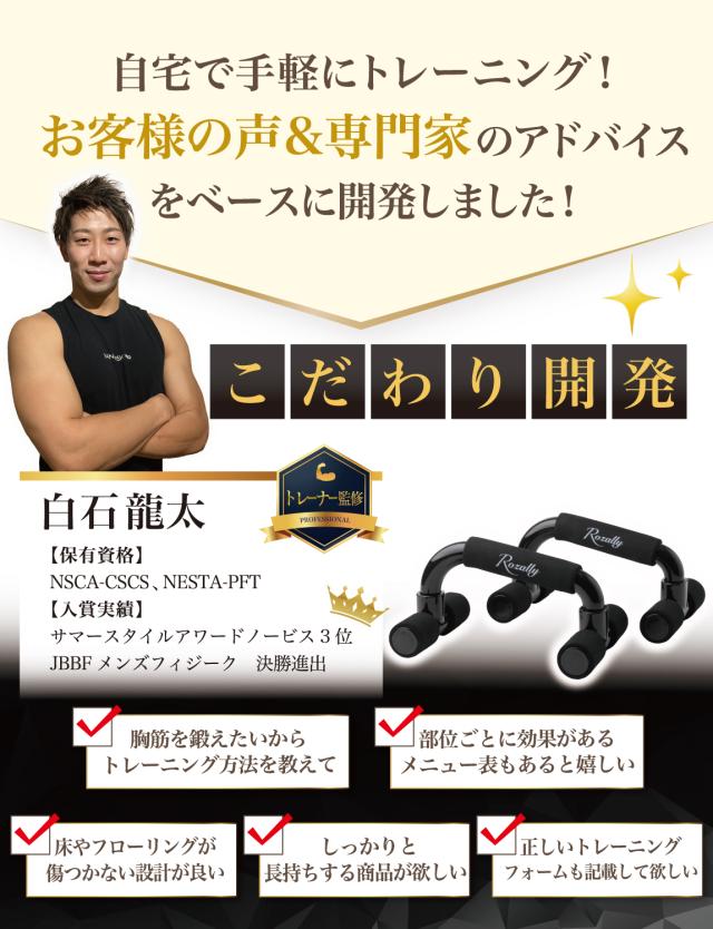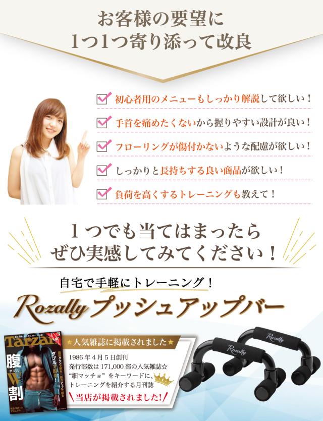 Rozally プッシュアップバー は仕事終わりの家で 静かに トレーニング ができるように、 耐摩耗性の素材を採用することで、 家でギシギシと摩擦が響かない”静音”の設計をさせて頂きました。 従来品の プッシュアップバー では 接続部分の素材が耐摩耗の素材となっていないことで、 テレビを見ながら トレーニング したらギシギシうるさかった… という意見もあり設計から見直して製品化しました。 ボディーメイク や フィットネス でも 初心者 が手軽に扱える トレーニング器具 として 話題沸騰中の商品になりますので、是非お試しください。 |