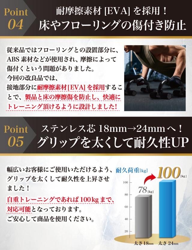 腕立て伏せ で 筋トレ をする時に 手首の負荷を減らすために使用する プッシュアップバー です。 ”大胸筋” の肥大や ”体幹強化” など腕立て は 上半身 を 鍛える のにカナリ有効な トレーニング です。 しかし、手首にかかる負荷も大きく補助する器具がないと 体重が手首に垂直にかかってしまい痛める原因になってしまいます。 本製品では 男性 や 女性 に問わず 初心者 の お客様に1500人以上に 筋力トレーニング の指導実績を持つ【現役トレーナー】の先生から アドバイスをもらい、 分かりやすい取扱説明書を添えて企画&開発しました。 |