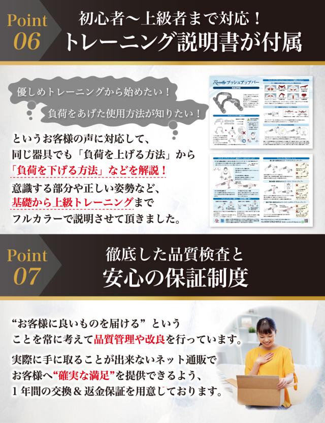 本製品では 男性 や 女性 に問わず 初心者 の お客様に1500人以上に 筋力トレーニング の指導実績を持つ【現役トレーナー】の先生からアドバイスをもらい、分かりやすい取扱説明書を添えて企画&開発しました。