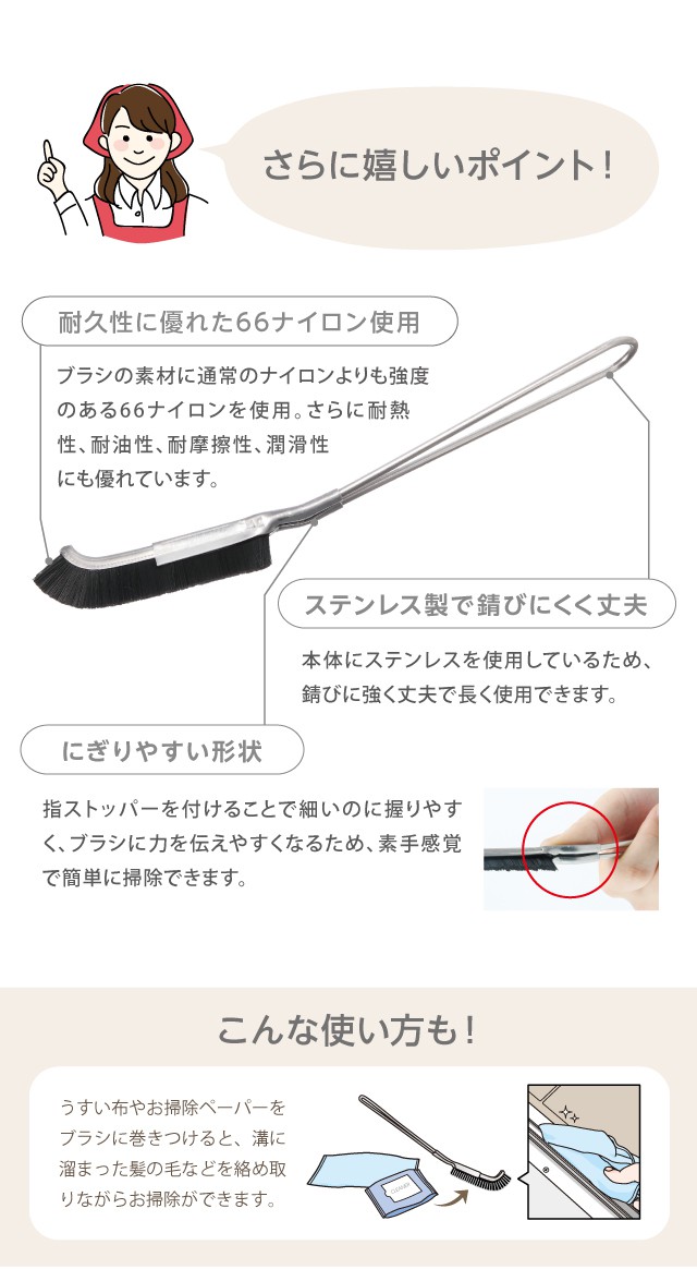 1 先端が「Jの字」になっているので今までの掃除ブラシでは届かなかった場所も掃除できる。