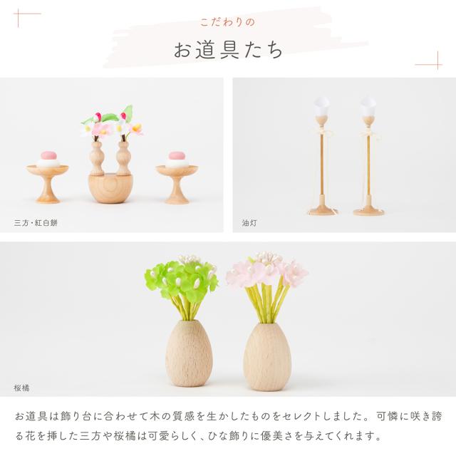 ※お道具のお花に黒い点や穴、パーツの接着部分に糊のはみ出しが見受けられる場合がございますが、生産工程上、避けられない仕様となります。