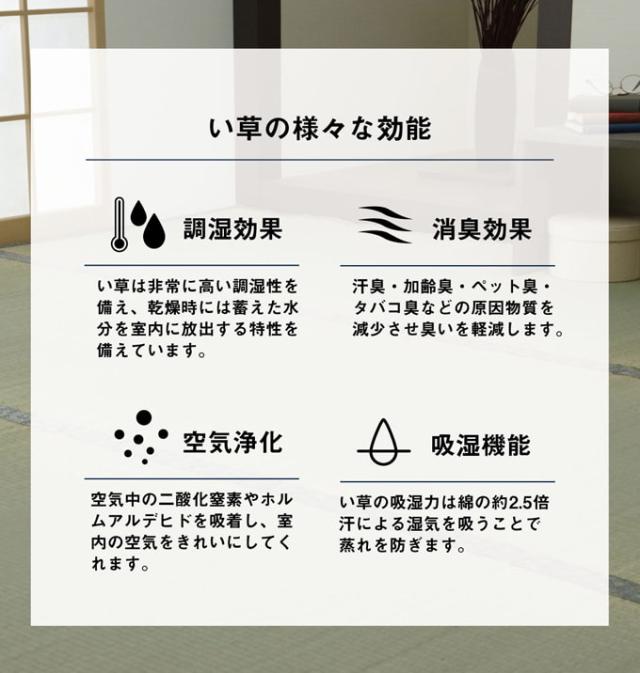 | 材質 | 【表地・裏地】い草100% ※双目織 【ヘリ】ポリプロピレン、ポリエチレン |