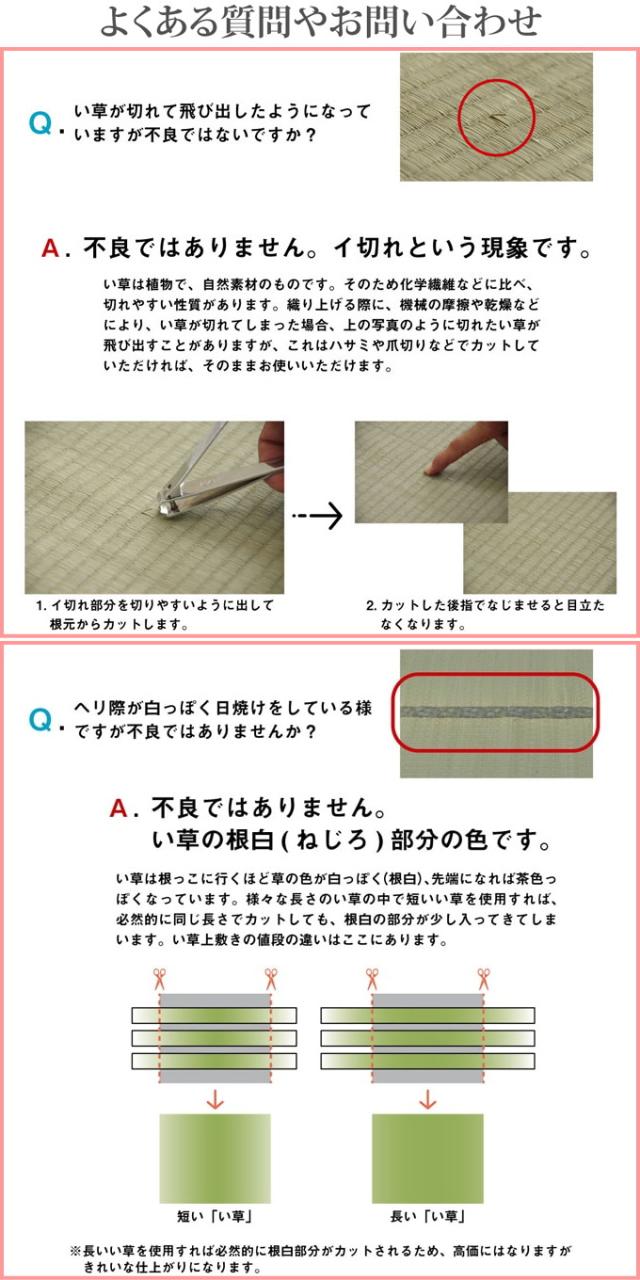 | よくある質問 | ■イ切れについて い草が切れて飛び出したようになっていることがありますが、商品特性上起こりえる「イ切れ」という現象ですので不良品ではありません。(ハサミ等でカットしてください) ■色合いと形状について い草の特性上、へり際やつなぎ合わせ部分(い草の根本と先端)が中央部分(い草の中央)の色と違って見えることがありますが、根白の部分を使用しているためですので不良ではありません。 い草はねぎと同じで根本が白色、中央は青緑色、先端は薄茶色となっており、これを組み合わせているので中央と端の色が異なり日焼けしたように見えていまうことがあります。 また、自然素材ですので、形状のバラツキやサイズが表示と多少異なることがあります。 ■カビについて 新品のい草製品はカビやすいため、できるだけ風通しの良いお部屋でご使用いただき、天気の良い日はお部屋の換気や2時間程度の日陰干しをして下さい。(梅雨時期は除湿器の使用をお勧めします) ■ご使用前に ご使用前に必ず乾いたぞうきんなどで2〜3回から拭きして下さい。 い草に浸透していない染土・塗料・樹脂が表面に付着しているのでそれらを取り除くためです。 その際多少色落ちする事がありますので新しい畳や、色の付きやすい絨毯等の上に敷く場合には新聞紙等を下に敷いて下さい。 ■シワについて 天然素材のためどうしても波打ったようなタタミシワがありますが、ある程度の日数が立つことでなじんできます。(まっ平らにはなりません) 目安としてウレタンなどの裏張は約2週間ほどでなじんできます。 裏無しの場合はピンでとめていただいた後、約4週間でなじんできます。 ■ご使用場所について 必ずこのサイズという決まりはありませんので、お部屋の広さや家具の配置などを考慮してください。 なお、地域によって団地間や江戸間など呼び名が異なりますので、お部屋いっぱいに敷き詰めたい場合はしっかりとサイズを確認してください。(製品特性上0〜5cmの誤差が出てしまうことがありますがご了承ください) フローリングでご使用の場合、裏張り加工をしていないものはフローリングでご使用されると滑りやすく、またシワになりやすいので必ずすべり止めシートを一緒にご使用してください。(畳の部屋であれば裏あり、裏無しどちらでもご使用いただけます) ■上敷鋲について 畳の部屋で敷き詰める場合は上敷鋲などのピンで留めるというのが一般的です。 入り口など人が多く通る箇所は10cm間隔、他は20〜25cm間隔を目安にしてください。 目安として「3帖…約30〜35本、4.5帖…約40〜45本、6帖…約45〜50本、8帖…約50〜55本、10帖…約60〜65本」となります。 |