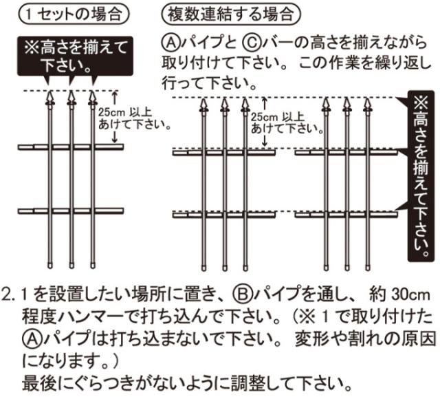 安全のため、必ず手袋を着用して作業を行ってください。 組立で、パイプをハンマーで打ち込む作業がございます。事前にご準備ください。 子供がぶら下がったり、物を掛けたりなど、必要以上の荷重をかけないでください。 組み立てた後、ぐらつきがないように調整してください。 |