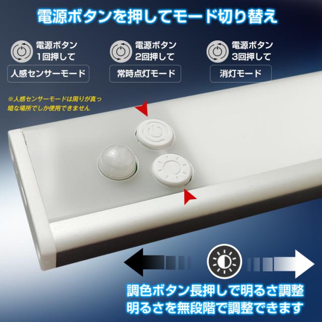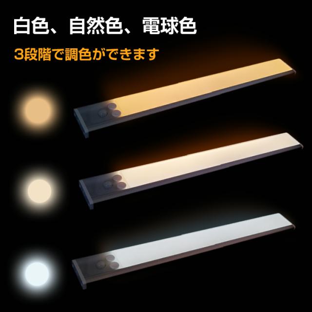 - 商品届きました。探していたのは薄型で30cmの長さの物。人感センサー、調光調色、充電式機能装備でとても満足しています。いい物を購入する事が出来ました。迅速丁寧な対応ありがとうございました。