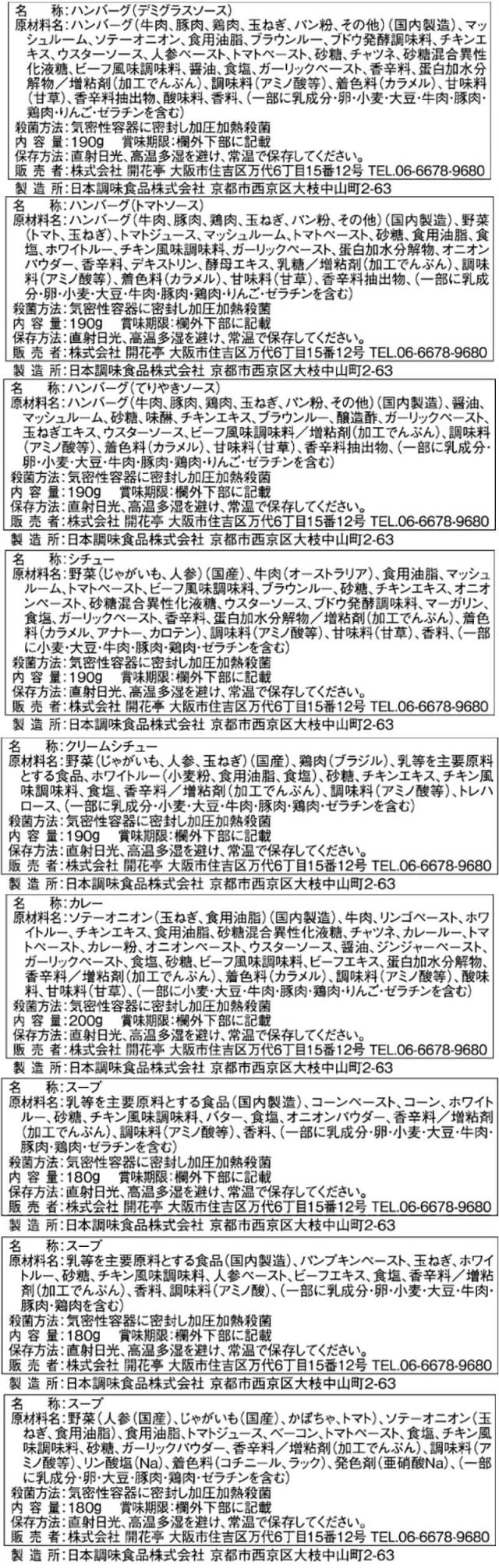 | 内容量 | 煮込みハンバーグ デミグラスソース 190g 煮込みハンバーグ トマトソース 190g 煮込みハンバーグ テリヤキソース 190g ビーフシチュー 190g チキンクリームシチュー 190g ビーフカレー 200g コーンポタージュスープ 180g パンプキンポタージュスープ 180g ミネストローネ 180g 9種 9食 |