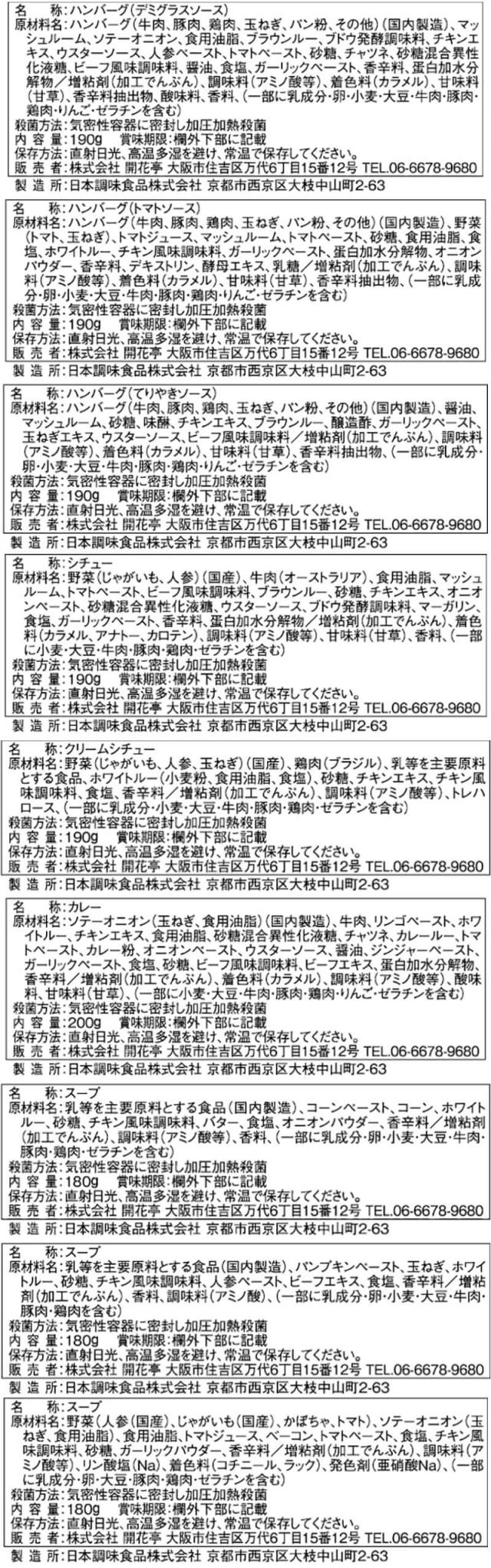| 内容量 | ■ ハンバーグ・スープ 6種 各2食 12食 セット 煮込みハンバーグ デミグラスソース 190g 煮込みハンバーグ トマトソース 190g 煮込みハンバーグ テリヤキソース 190g コーンポタージュスープ 180g パンプキンポタージュスープ 180g ミネストローネ 180g ■ シチュー・カレー・スープ 6種 各2食 12食 セット ビーフシチュー 190g チキンクリームシチュー 190g ビーフカレー 200g コーンポタージュスープ 180g パンプキンポタージュスープ 180g ミネストローネ 180g 2種類のセットからお選びいただけます。 |
