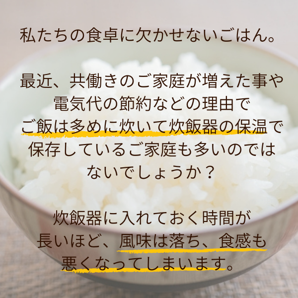 炊飯器で炊きあがったご飯を保温状態にしておくと、黄ばみが発生し、乾燥してパサパサしてしまうのは、内釜自体が保水できる構造ではないこと、保温による水分の発散の為に起きる事象です。