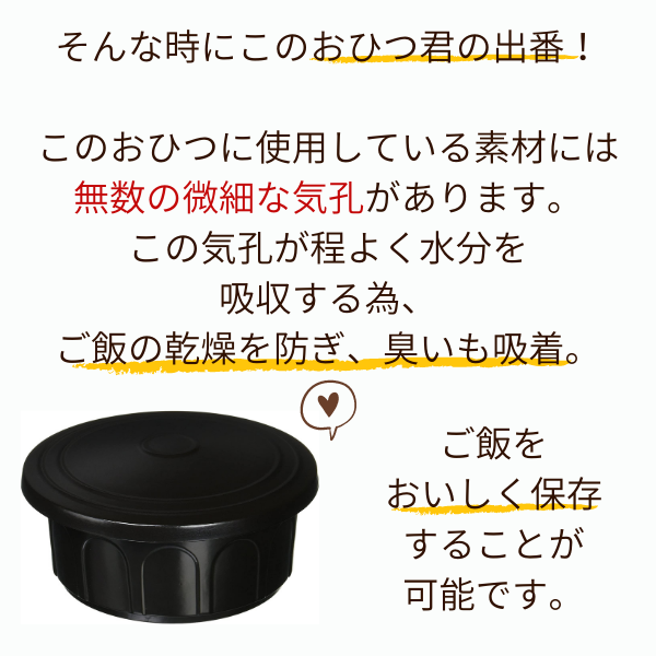 この気孔が程よく水分を吸収する為、ご飯の乾燥を防ぎ、ニオイを吸着するので、おいしく保存することが可能。