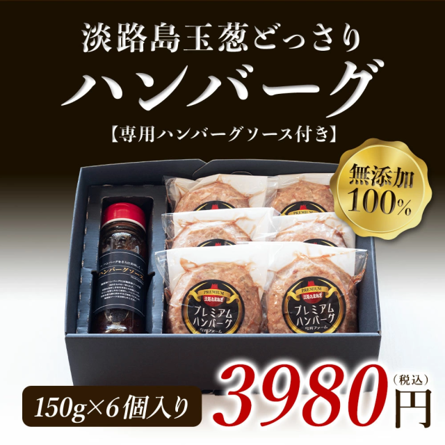 大満足のこだわり150g×6個入りハンバーグ。無添加、牛肉100%、もちろん厳選された淡路島玉ねぎを使用した淡路島ハンバ−グです。
