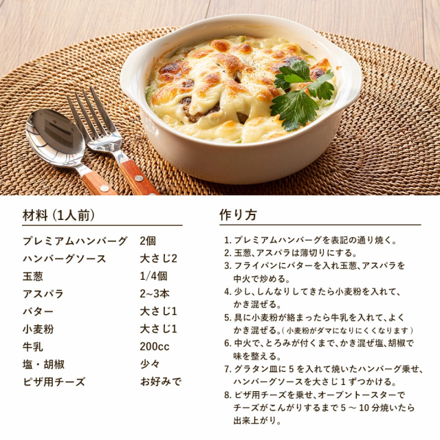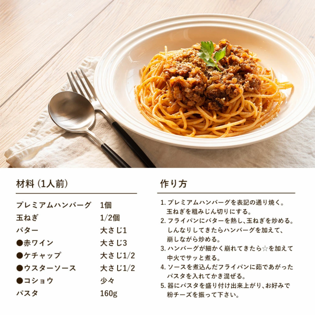 ハンバーグ:牛肉(豪州、国産)、玉ねぎ(淡路島産)、全卵、パン粉、牛乳、醤油、塩、胡椒、(一部に小麦、乳成分、大豆、牛肉を含む)ソース:みりん(国内製造)、玉ねぎ(国産)、ワイン、醤油、アップルピューレ、コーンスターチ、トマトピューレー、加工黒糖、酢、かつおだし、おろし生姜、(一部に小麦・大豆・りんごを含む)