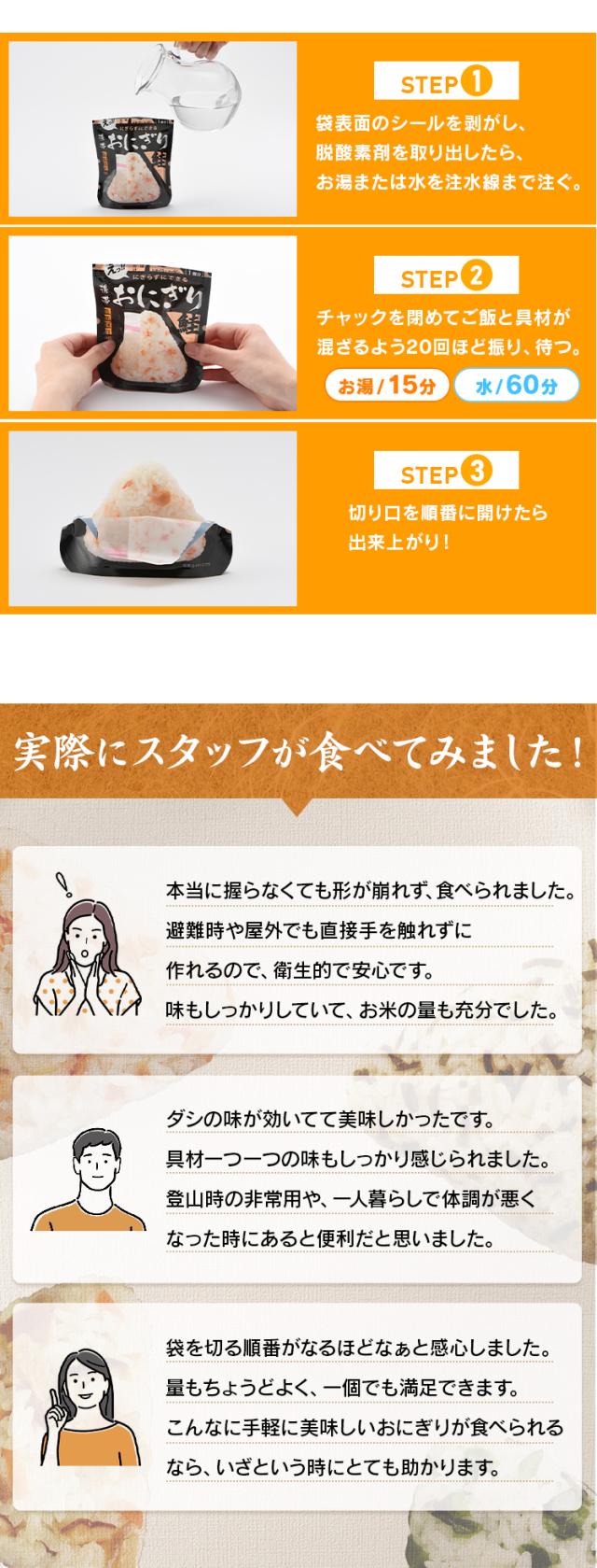 お湯または水を入れるだけで具材の旨味がギュッとおいしい三角形のおにぎりができあがります。
