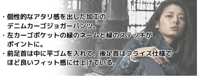 個性的なアタリ感を出した加工。デニムカーゴジョガーパンツ。