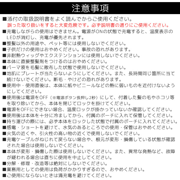 ■地肌にプレートが当たらないようにしてください。また、長時間同じ箇所に当て続けないでください。断毛・やけどの恐れがあります。