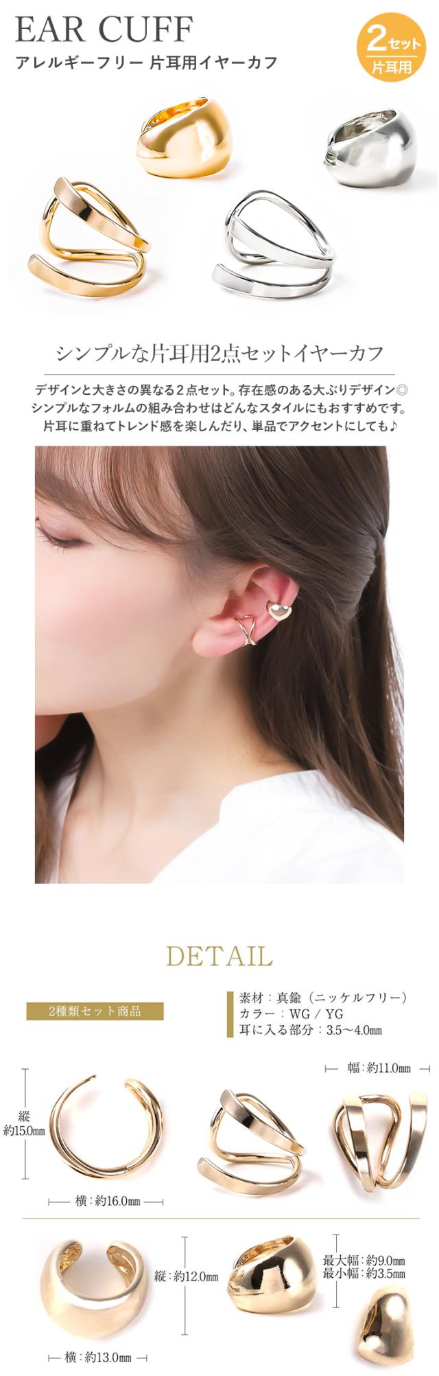 デザインとサイズ違いのお得なイヤカフ2個セット。どんな組み合わせでもおしゃれにスタイルアップ。シンプルな大ぶりデザインのイヤーカフスはキラキラと輝く人気の耳飾り。「 18金(18K)仕上げ/ プラチナ 仕上げ 」の華奢で上品なイヤリングはオフィスや通勤はもちろん、リモートワークのときに、お顔周りを華やかに見せてくれます。結婚式やパーティーにも。ニッケルフリーで金属アレルギーに対応しているので、お肌に優しく安心です。