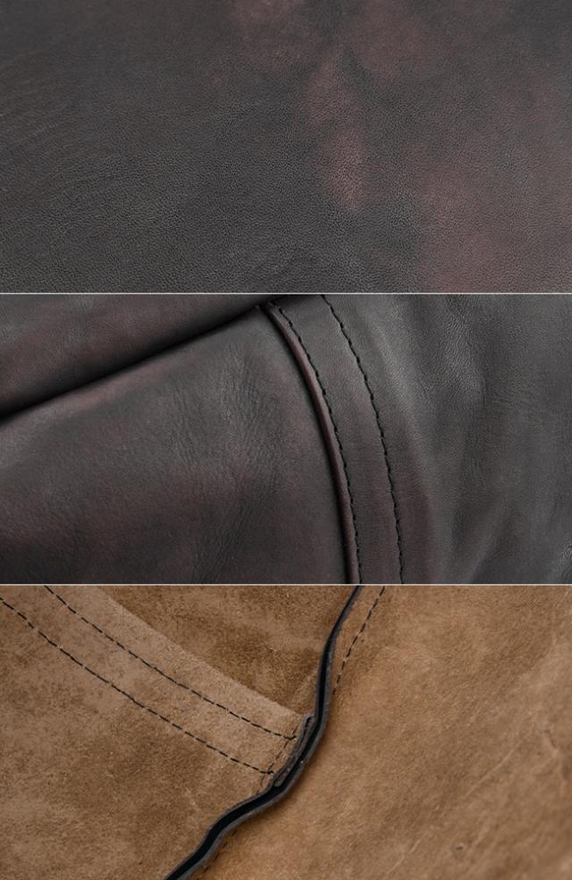 姫路産のフルベジタブルタンニンレザーを丘染めと呼ばれる伝統的な手染め製法で染め上げ、コガシ加工、オイル加工を施し、ヴィンテージのような風合いに。表裏で異なる素材感と、経年変化も楽しめます。
