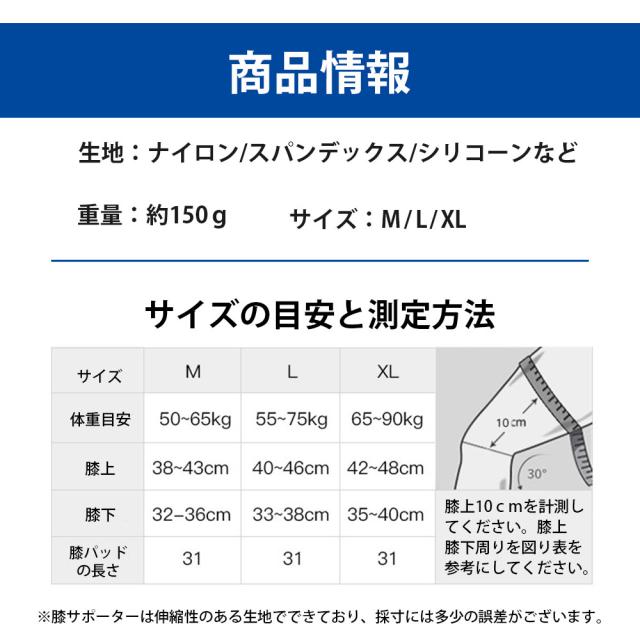 - 膝の弱い私には、このサポーターが最適です。 足が細い方なのでMサイズを注文。 使用していてもズレないので良いです。 仕事柄、膝をついたりしなくてはならない事もあるのですが、楕円形のシリコンが膝を保護し...
