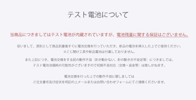尚、テスト電池の消耗や、電池交換前の動作不良につきまして返品や交換等対応は致しかねます。