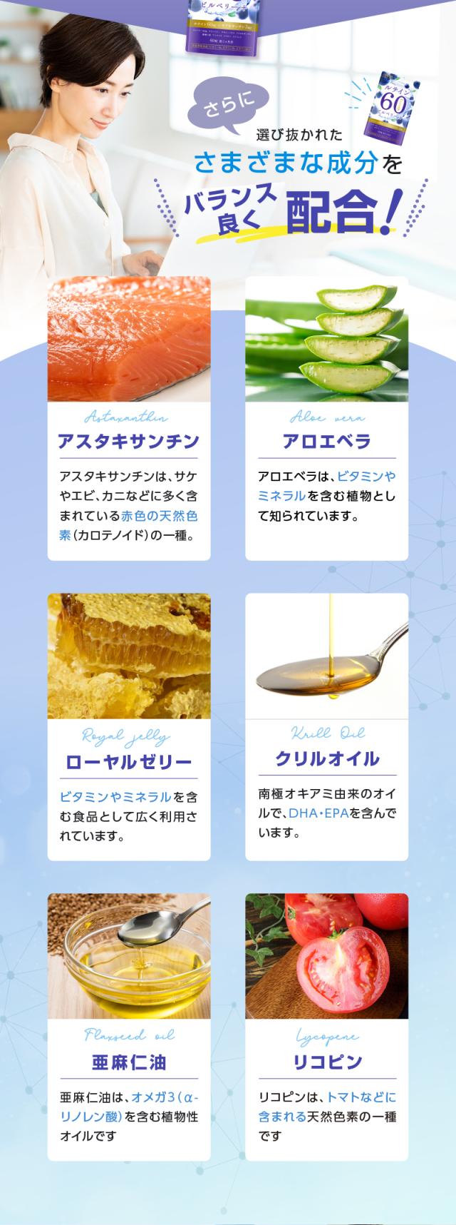 アスタキサンチン、アロエベラ、クリルオイル、ローヤルゼリー、リコピンなど、日々のすこやかさを考えた成分を組み合わせています。