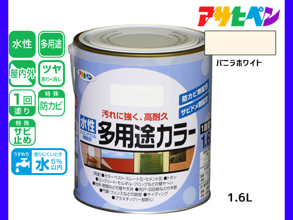アサヒペン 水性多用途カラー 1.6L バニラホワイト 塗料 ペンキ 屋内外 1回塗り 耐久性 外壁 木部 鉄部 サビ止め 防カビ 無臭